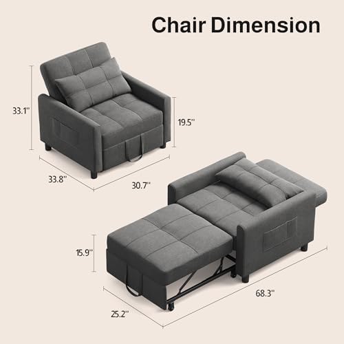 The Ahomly 3-in-1 Convertible Sofa Chair Bed is the perfect solution for those seeking versatile seating and sleeping options in compact living areas. Crafted with modern linen fabric in a stylish dark grey, this sleeper chair effortlessly converts between a supportive chair, a comfortable recliner, and a full-size bed in just seconds. Its adjustable backrest locks into three positions, allowing you to find the perfect angle for work, relaxation, or sleep without any complicated steps.