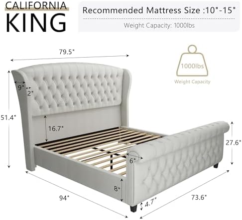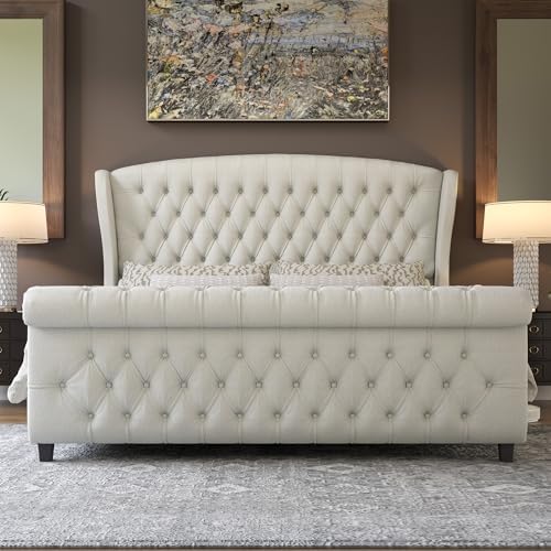 Experience timeless elegance and exceptional comfort with the AMERLIFE California King Size Platform Bed Frame. Upholstered in premium cream chenille fabric, this velvet sleigh bed showcases a beautifully rolled scroll wingback headboard and footboard enhanced by hand-applied button tufting. Crafted by skilled artisans, the bed offers a unique blend of contemporary style and refined artisan detailing that complements any bedroom décor.