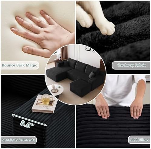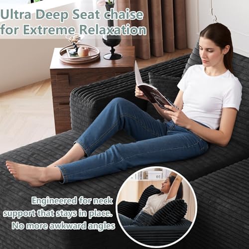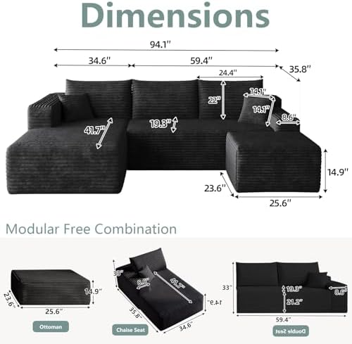 Experience unparalleled comfort thanks to premium corduroy fabric that is soft, breathable, and durable, giving your living room a stylish yet inviting feel. The sectional includes three large cushions and two throw pillows to maximize seating comfort and maintain long-lasting support. The spacious 59.4 inch chaise lounge is padded with high-resilience foam and coil springs for a cloud-like rest, perfect for lounging, reading, or unwinding after a busy day without any need for tools or assembly.