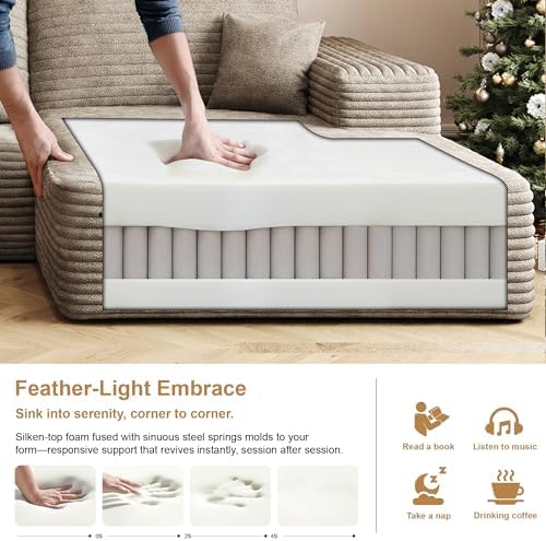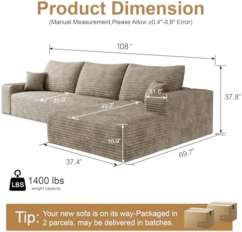 Transform your living space with the AUGOP 108 inch modular sectional sofa, designed to combine contemporary style with exceptional comfort. Its sleek L-shaped design, upholstered in plush camel corduroy fabric, provides both a sophisticated look and a cozy feel. Perfect for living rooms, apartments, or bedrooms, this versatile sectional couch maximizes your space while creating a warm, inviting atmosphere. Whether you’re hosting guests or relaxing solo, this boneless deep seat couch offers a timeless addition to your home.