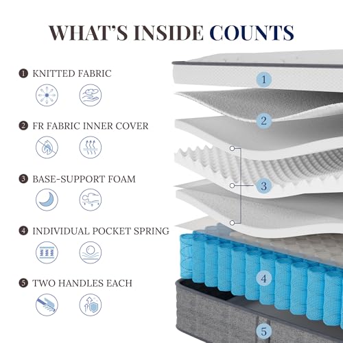 Constructed with reinforced edge support featuring upgraded pocket springs surrounded by high-density foam, this mattress prevents sagging and rolling, maximizing usable sleeping space and extending mattress lifespan. Simple to set up and compatible with all bed frames, it includes convenient side handles for easy maneuverability. Backed by a 10-year limited warranty, this fiberglass-free mattress delivers lasting quality and peace of mind for a restful sleep experience.