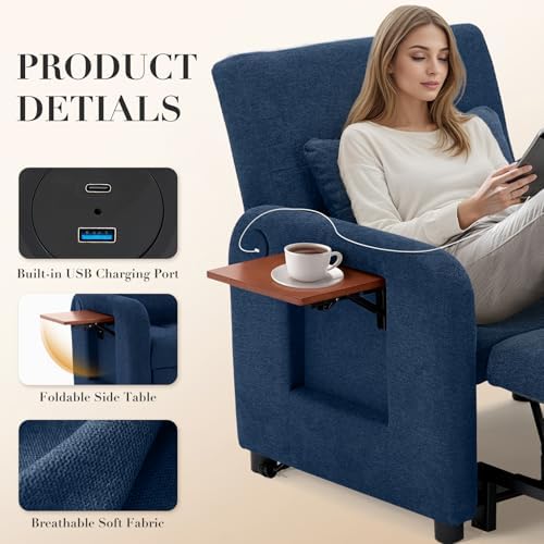 Enjoy personalized comfort with a 3-position adjustable backrest (106°, 120°, and 180°) and a removable pillow that supports your neck and head. The built-in USB port ensures your devices stay charged and accessible. Plus, a foldable side table offers a practical surface for drinks, books, or work essentials, neatly folding away when not needed.