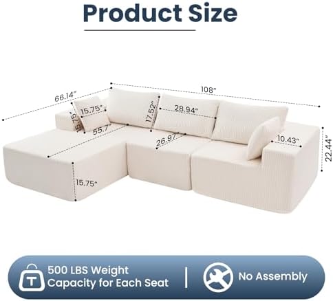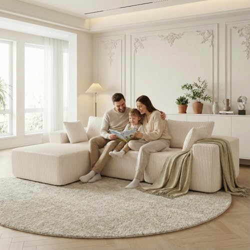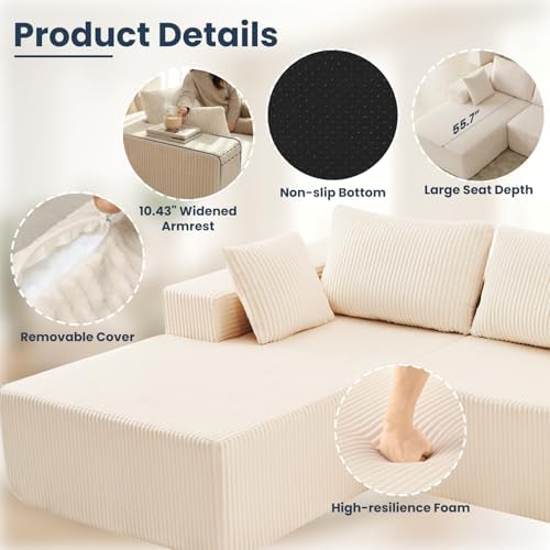 Experience the perfect blend of comfort and durability with the DUMOS 108 inch Boneless Cloud Sectional Couch. Crafted with skin-friendly, breathable, and stain-resistant corduroy fabric, this modular sofa is designed for everyday relaxation. The high-resilience foam cushions provide superior support, while the three removable back cushions and two plush throw pillows enhance your lounging experience. Its deep seat and ergonomic design let you stretch out fully or curl up comfortably for hours, making it ideal for family living rooms or cozy bedrooms.
