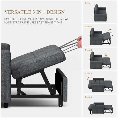 Enjoy customizable relaxation with five adjustable backrest positions ranging from 90 to 180 degrees, allowing you to find the ideal angle for sitting, reclining, or sleeping. Built with a sturdy solid wood frame and reinforced iron pull-out bed, it supports up to 700 pounds securely. Upholstered in soft, skin-friendly linen fabric with a thick 5-inch sponge cushion, this loveseat offers plush comfort. Convenient side pockets provide easy access to remotes, magazines, and more. Assembly is quick and simple, letting you enjoy your new sofa bed in just 20 minutes.