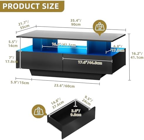 The DWVO LED Coffee Table combines modern design with practical storage, making it the perfect centerpiece for your living room. Featuring 16 vibrant LED colors and 4 dynamic modes controllable via remote, this table effortlessly sets the mood for relaxing evenings or lively gatherings. Its sleek black high-gloss finish and rectangular shape add a sophisticated touch that complements any décor.