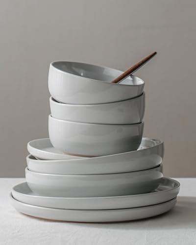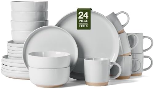 The Famiware Milkyway Stoneware Dinnerware Set offers a complete service for six, including 24 pieces: 6 dinner plates (10.25 inch), 6 salad plates (8 inch), 6 coffee mugs (3.5 inch), and 6 cereal bowls (5.75 inch). Crafted from high-quality food-grade stoneware, this set features a unique speckled glaze fired at 2340℉ for over 13 hours, ensuring an exceptionally durable and scratch-resistant surface that withstands daily use without worry.