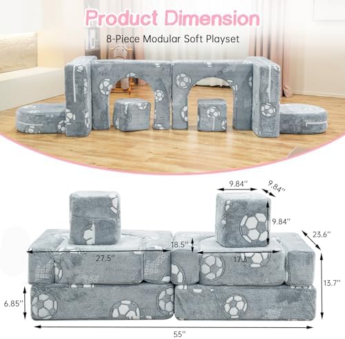 Crafted from CPC and CPSP certified safe materials, this toddler-friendly couch is odor-free and free from harmful substances, ensuring safe playtime for children aged 1 to 16. Its thickened plush fabric features fun patterns like clouds, footballs, unicorns, and dinosaurs that glow in the dark after exposure to sunlight or strong lighting for up to 30 minutes. The set includes 8 modular pieces that transform into various imaginative shapes such as tents, castles, slides, and sofas—perfect for playrooms, bedrooms, and daycare centers.