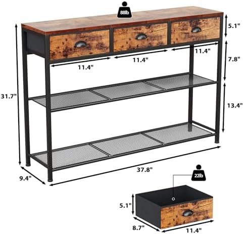 Featuring three upgraded fabric drawers with easy-pull arch handles, this console table offers lightweight, breathable, and dustproof storage to keep your essentials neatly organized and within reach. Two open mesh shelves provide excellent heat dissipation—perfect for media devices such as DVD players, TV boxes, or gaming consoles. Its compact footprint and slim profile make it ideal for apartments or rooms with limited space.