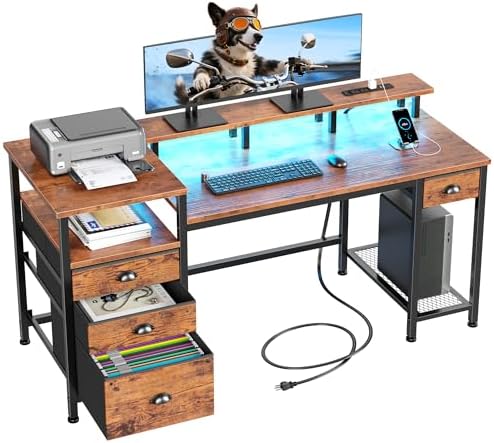 Illuminate your home office or gaming setup with the built-in RGB LED light strip, offering 20 color options, 22 dynamic modes, and adjustable brightness to set the perfect mood. With a full-size monitor stand and multiple storage solutions including 4 drawers, a fabric file cabinet, and 3 open shelves, this desk keeps your workspace organized and comfortable, helping reduce neck and back strain while maximizing productivity.