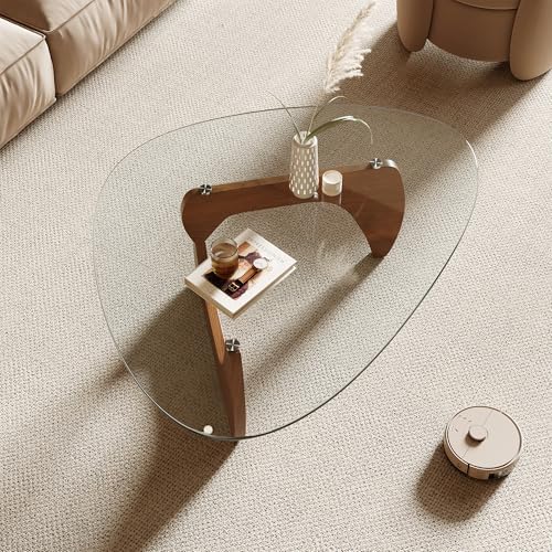 The Honyee Modern Coffee Table features a unique triangle-shaped tempered glass top paired with natural wood finish MDF legs, creating a sophisticated centerpiece for any living room. Its sleek design complements contemporary and minimalist decor, enhancing the overall aesthetic with a touch of modern flair.