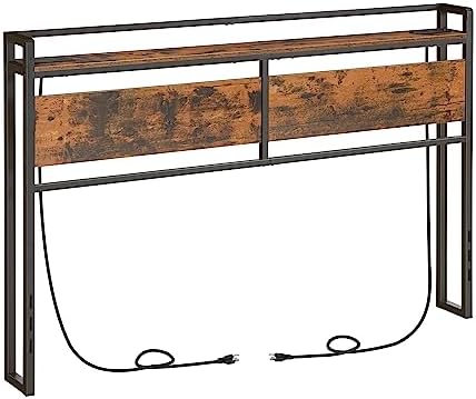 Beyond its functionality, this headboard boasts a rustic industrial design with an exquisite brown particleboard panel contrasted by a sturdy black iron frame. The open storage shelf measuring 60.2 inch long by 5.9 inch wide provides ample space for essentials like glasses, alarm clocks, or books to keep your sleeping area tidy. Crafted with high-quality materials and supported by four adjustable feet, it ensures stability on any floor type, while the thoughtful guardrail adds both safety and aesthetic appeal.