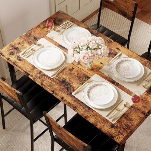 Crafted with rustic MDF wood and sturdy steel frames, this dining set exudes an appealing industrial and modern style. The set features a rich woodgrain finish and an I-shaped table design that blends seamlessly with various interior styles. High backrests and thick padded seats on the chairs ensure comfortable support, while the table and chairs offer robust weight capacities—220 lbs for the table and 300 lbs per chair—to provide lasting durability.
