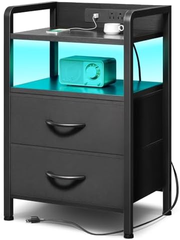 Say goodbye to clutter with the built-in charging station, which includes two USB ports and two AC outlets, keeping your devices powered up and within easy reach. The nightstand also offers practical storage solutions with two spacious fabric drawers and a wide, water-resistant tabletop. Adjustable footpads ensure the nightstand sits perfectly level beside your bed or sofa.
