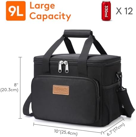 Measuring 10 inch × 6.7 inch × 8 inch with a 9-liter capacity, this insulated lunch box easily accommodates up to 12 cans or your favorite meals, ideal for work, picnics, or beach trips. The exterior is made from water-resistant 600D Oxford fabric that repels dirt and moisture, keeping the bag clean and durable. High-quality zippers and spill-proof construction prevent leaks, so you can carry liquids confidently.