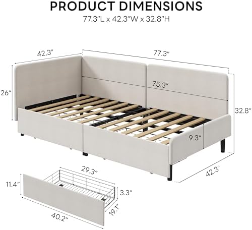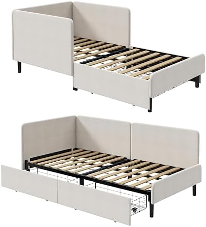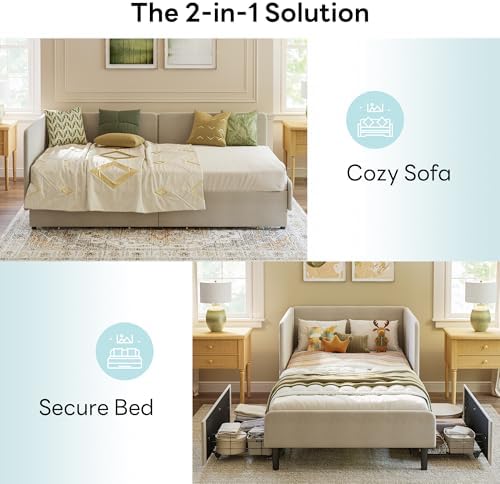 Switch effortlessly between a cozy twin bed for restful nights and a stylish sofa for daytime lounging. Built with integrated full-length safety rails, this daybed ensures security for users of all ages. Two spacious storage drawers provide ample room for bedding and personal items, keeping your area neat and organized.