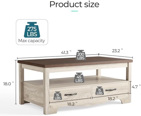 Transform your living room with the LINSY HOME Farmhouse Coffee Table, designed to combine rustic charm with practical functionality. Crafted from P2-grade engineered wood with a waterproof surface, this coffee table offers a spacious 23.2 depth by 41.3 width by 18 height inch surface that supports up to 275 pounds. Its elegant curved base and metal handles enhance both style and ease of use, making it a perfect centerpiece for any farmhouse-inspired interior.