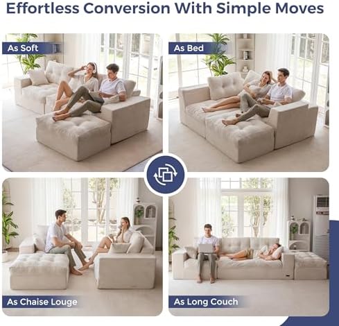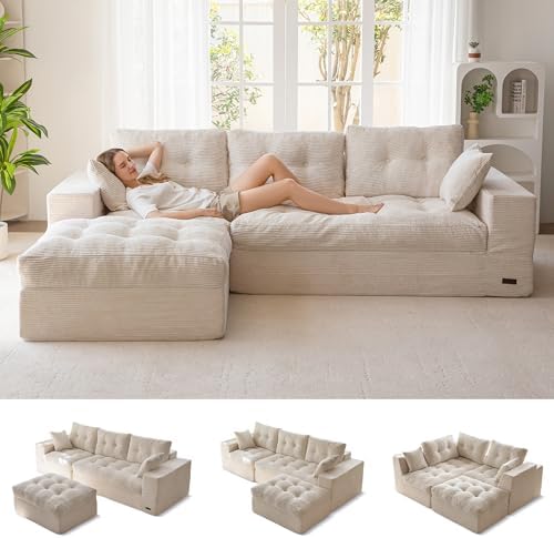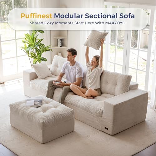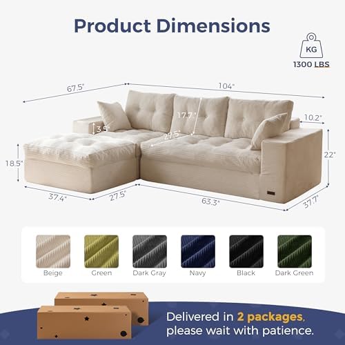 The MAXYOYO 104 inch L Shaped Modular Sectional Sofa with Ottoman offers a cloud-like lounging experience right out of the box. With no assembly required, simply unpack and allow the sofa to regain its shape within 72 hours while gently patting the cushions to enhance their elasticity and luster. This makes it an ideal choice for those seeking a hassle-free, stylish upgrade for their living room.