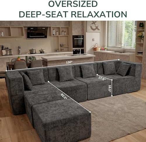 Experience ultimate relaxation with the MONVANE 130 inch Modular Sectional Cloud Couch, designed to transform your living space into a cozy retreat. Crafted from soft and durable chenille fabric, this 6-seater couch exudes luxury while resisting scratches and pilling for long-lasting beauty. The extra-wide armrests provide convenient surfaces to hold your tablet, snacks, or drinks, enhancing your comfort during leisure time. Perfectly sized with a 27.56 inch deep seat and high-density memory foam cushions, it delivers superior support and plush seating.