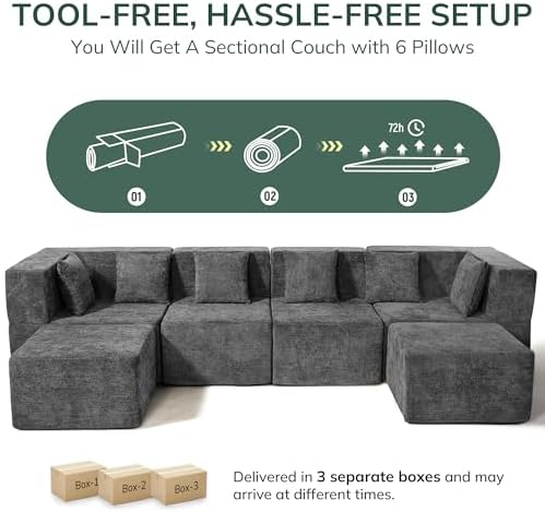 This sectional features a smart modular design made up of six small individual pieces, allowing you to easily reconfigure the layout to suit your room and lifestyle. Whether placed in a living room, bedroom, or apartment, the couch adapts effortlessly and even converts into a sleeper sofa for guests. Delivered compressed in three boxes with no assembly required, it quickly fluffs back to its original shape within 72 hours. Anti-skid particles on the base ensure it stays securely in place, offering safety and stability for your home.
