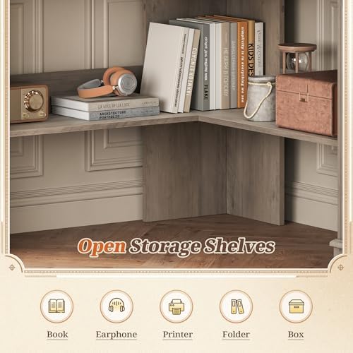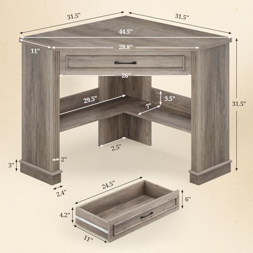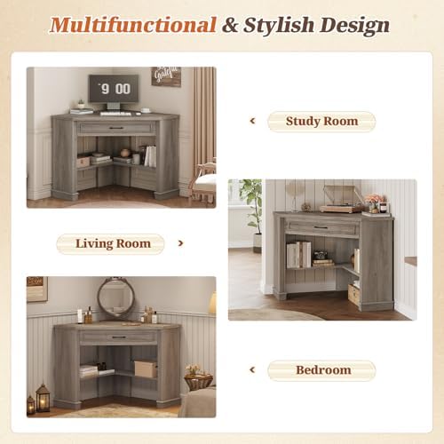 This corner desk features a convenient drawer and open storage shelves on the lower level to keep your essentials organized and desktop clutter-free. Whether you need space for books, files, storage baskets, or decorative items, this desk adapts effortlessly. Its modern farmhouse design complements diverse home styles, making it suitable for living rooms, bedrooms, study rooms, or even as a vanity table. Simple to assemble with clear instructions, it is designed to fit seamlessly into your lifestyle.