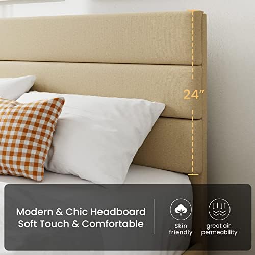Crafted with skin-friendly polyester velvet upholstery and dense foam padding, the headboard provides a soft and breathable resting surface. The sturdy wooden slats and heavy-duty metal support bars ensure longevity and stability, accommodating weights up to 800 lbs while maintaining a noiseless experience thanks to the EVA mute bar.