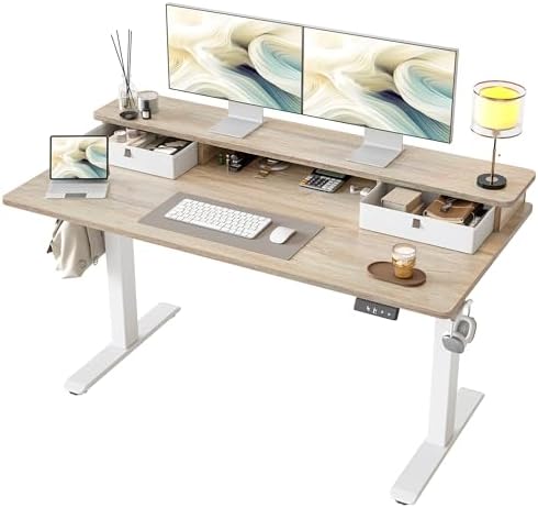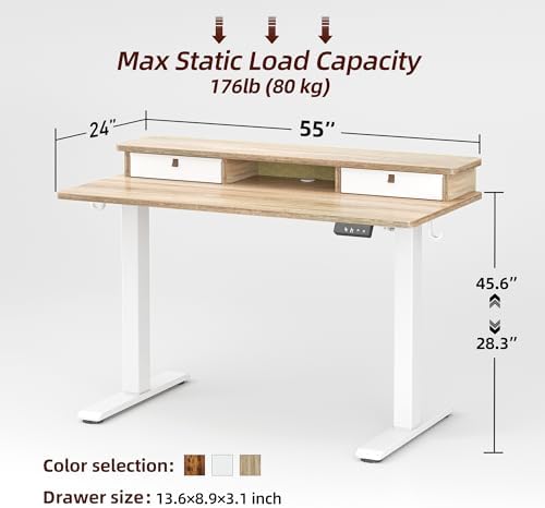 The TIQLAB Standing Desk offers seamless sit-to-stand height adjustment from 28.3 to 47.2 inch, controlled by an intuitive one-touch button. This electric desk quickly and smoothly raises or lowers to your preset height, making it ideal for computer workstations, gaming setups, or study environments at home or in the office. Its modern maple finish and spacious 55 by 24 inch surface complement any workspace.