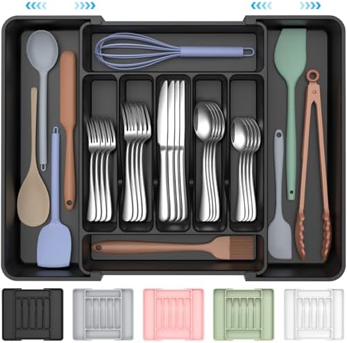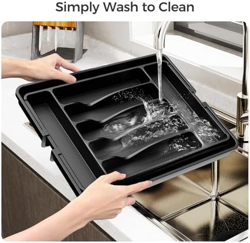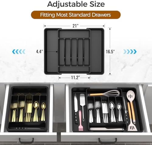 The Ukeetap Extra Large Expandable Silverware Organizer is designed to optimize your drawer storage with its 7-9 compartment layout and two expandable panels. Its deep, adjustable compartments fit a wide range of utensils like spoons, forks, knives, and more, enabling you to keep your kitchen well-organized and clutter-free. Measuring from 12.4 inch to 21 inch in width, it fits most standard drawers perfectly when measured beforehand.