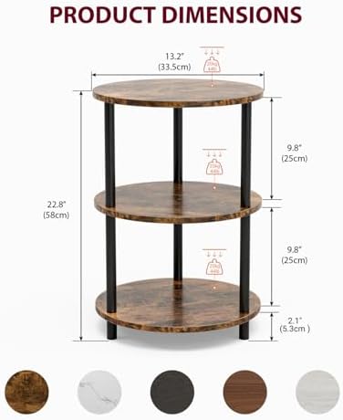 Measuring 13.2 inch in diameter and 22.8 inch tall, this narrow side table features three spacious tiers ideal for organizing books, magazines, or decorative items. Built with sturdy steel legs and reinforced tubing, it supports up to 44 lbs per shelf. Adjustable rubber feet protect your floors and keep the table stable on uneven surfaces.