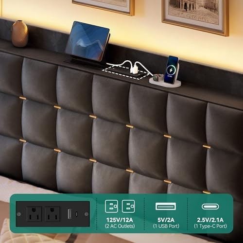 Experience the perfect blend of style and functionality with the YITAHOME King Size Bed Frame. Upholstered in luxurious grey velvet, this platform bed includes a built-in charging station featuring 2 AC sockets, 1 USB port, and 1 Type-C charging port, allowing easy access to power your electronic devices. The integrated storage shelves on the headboard keep your essentials like books and decorations within reach, enhancing your bedroom’s organization and convenience.