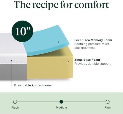 Discover the Zinus 10 inch Green Tea Essential Memory Foam Mattress, designed to offer a medium feel that perfectly balances support and comfort. This mattress features breathable Airflow memory foam infused with natural green tea extract to keep your sleep environment fresh and odor-free night after night. Its ability to contour closely to your body helps relieve pressure points, improve circulation, and reduce joint stress, making it ideal for a restful and restorative sleep experience.